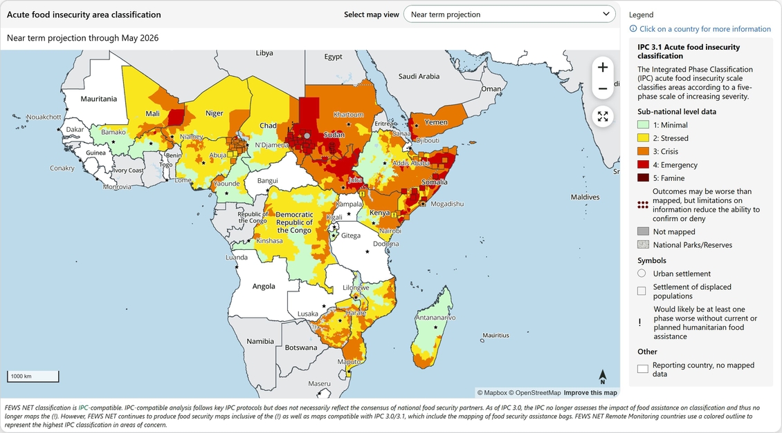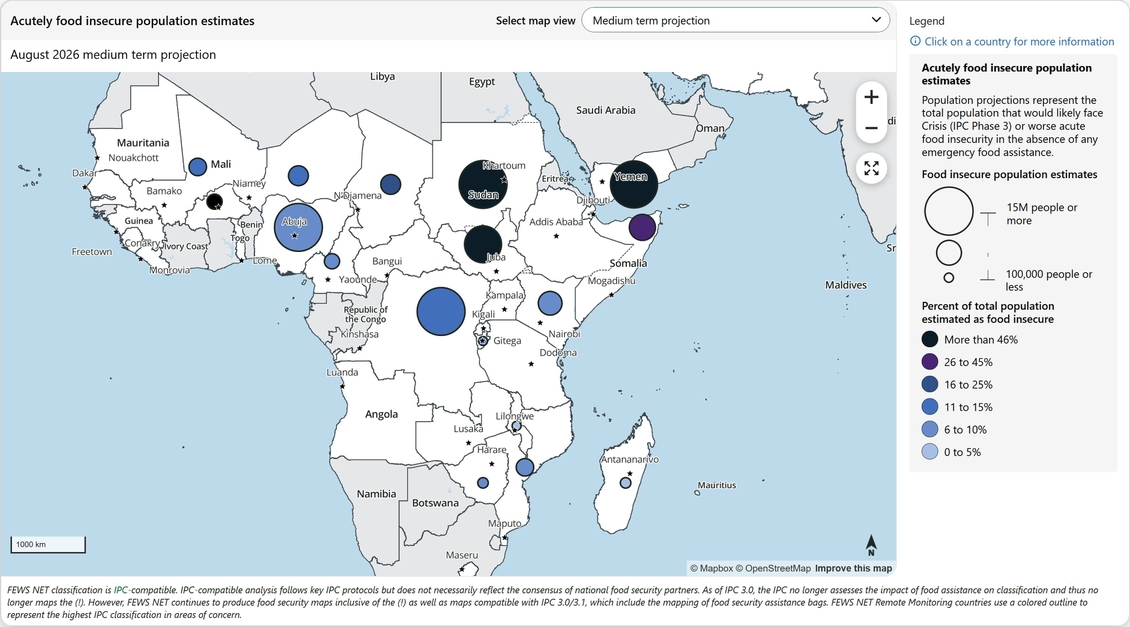 Alcune stime di FEWS.NET (attualmente presenti nella propria homepage) riguardanti le popolazioni con grave insicurezza alimentare